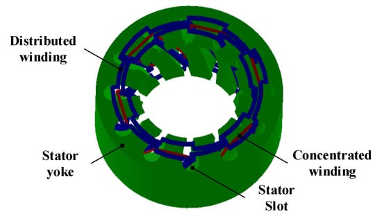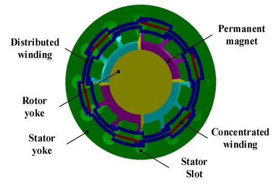 Most previous research has only considered the generator ontology analysis, and only a few studies have used a multi-DOF motor as the wind turbine generator. In [19], a multi-objective multi-DOF optimization control method using the model predictive approach was introduced. The control system therein exhibited excellent dynamic performance. Moreover, generator power fluctuations and drive train transient loads were both reduced. However, the control model was linear; thus, the accuracy of the system decreased due to wind fluctuation. Reference [20] focused on a multi-DOF ultrasonic motor using the in-plane deformation of () (PZT) elements, presenting its working principle, and driving circuit requirements. However, only the basic structure and working principle of the motor were considered, neglecting its magnetic characteristics.