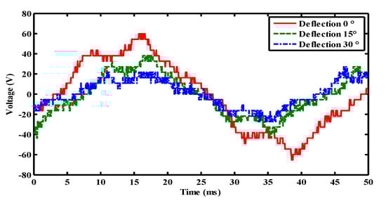 Only the phase voltage and induced voltage were compared, because the phase current can be calculated from the phase voltage, and the flux linkage cannot be directly measured using an oscilloscope. The oscilloscope results showed excessive harmonics; hence, we eliminated these harmonics using a low-pass filter in Matlab. Phase A is considered as an example here, and the impact of rotor deflection on phase and induced voltages are shown in Figure 31 and Figure 32, respectively.