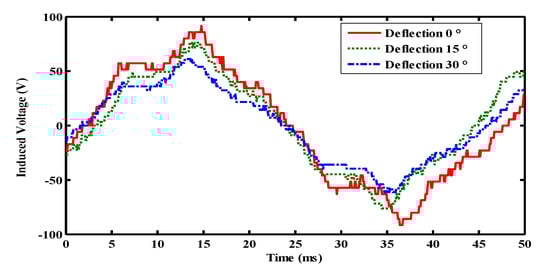 In Figure 23 and Figure 25, the amplitude and phase of the voltage and flux linkage remain nearly equal before and after a deflection. Therefore, the influence of harmonics on voltage and flux linkage is minimal. According to Figure 24 and Figure 26, the amplitudes of current and induced voltage decrease, however, the induced voltage curve is relatively smoother than that of the current; thus, harmonics have a smaller effect on the induced voltage than the current. As can be observed here, harmonics can not only affect generator characteristics, but also reduce service life. Therefore, controlling harmonics is essential.