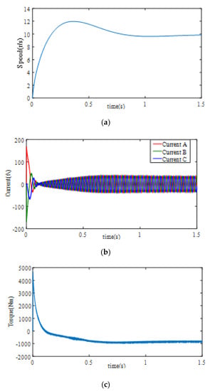 The generator power generation characteristic curves are obtained in Figure 34. Figure 34a–c show the speed, current and torque curves of the generator, respectively.