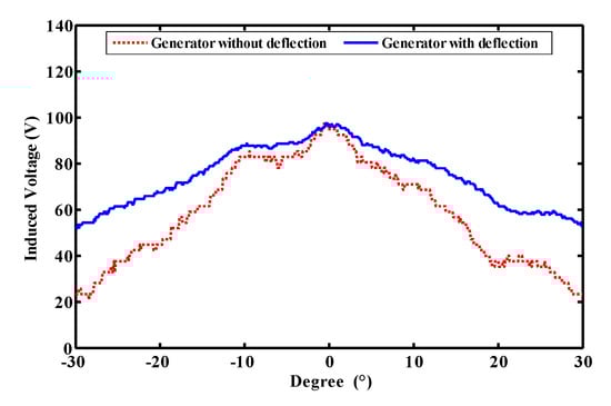 - The generator’s operation characteristics before and after deflection are compared, and voltage variation with wind direction is demonstrated.