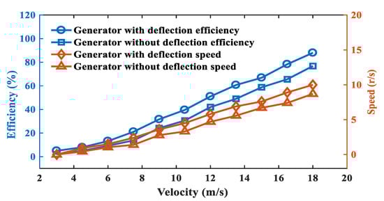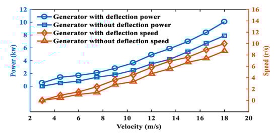 Figure 35 shows the voltage comparison curves post deflection. The voltage nearly maintained a peak value when the rotor deflection angle changed with the change of wind direction. Moreover, the voltage variation was substantial when no deflection occurred in the rotor. Thus, the wind tunnel experiment confirmed that the multi-DOF deflection-type PMSWG can significantly improve wind utility. The power and efficiency comparison curves post-deflection are presented in Figure 36 and Figure 37, respectively. Both power and efficiency can improve by approximately 8 to 10 when compared with no deflection in the rotor, making it more attractive than other wind generators.