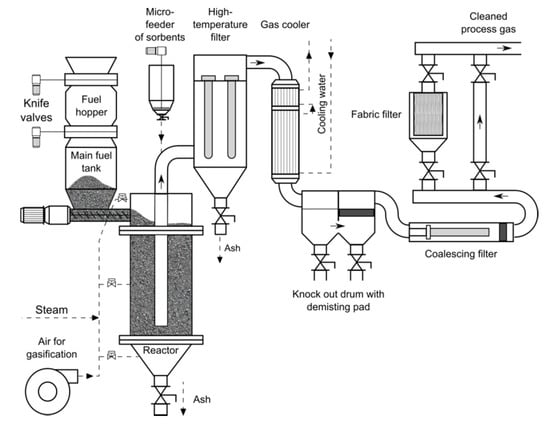 The experimental set-up utilized for this research was localized in the Center for Clean Coal Technologies in Zabrze, Poland. The installation was based on a pilot GazEla reactor. The gasifier is a fixed-bed, mixed-flow reactor, where fuel is fed from the top and an air/steam mixture is introduced into three characteristic zones of the bed. The innovative part of the reactor is a method for the recovery of hot syngas directly from the gasification zone. For the gasification of biomass, the reactor is characterized by 60 kWth input and a cold gas efficiency (CGE) of ca. 67%. More results regarding the gasification of various fuels and a detailed description of its operation can be found in the literature [,].