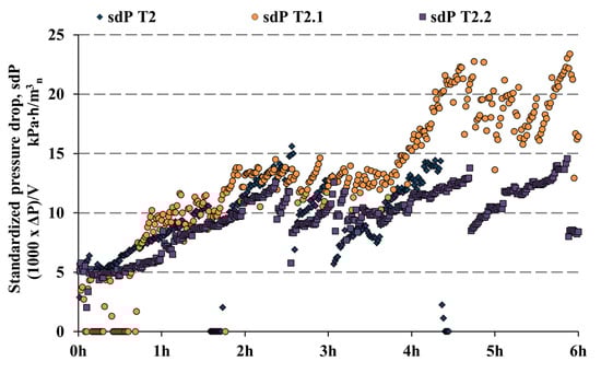 In Figure 5, it can be seen that, in T2.1, the filtration behavior adopted two separate patterns. In the first part of the tests, the pressure drop increased steadily, up to the set point of baseline dP (<2.5 h). At this time, regeneration pulses occurred every ca. 4–5 min, which was never observed for continuous stable runs, indicating that the filter cake kept sticking to the surface of the filters. To keep the unit in operation, the pressure drop set point was not changed until ca. the fourth hour of the test. From previous experience, a stable filtration pattern can be recovered for some cases where the thickness of the filter cake layer is deliberately, substantially increased. A thicker layer of filter cake tends to drop off the elements in larger flakes; however, this can also lead to patchy cleaning and irreversibly higher operational baseline of the filter. In this case, the method was successful, and, after the fifth hour, the time intervals between pulses started to increase. This can be observed by the dropping slopes of the dP curve between subsequent regeneration cycles. In stable filtration runs noted for both T2 and T2.2, the duration between regeneration pulses reached the conventional 1 h to 1 h 15 min.