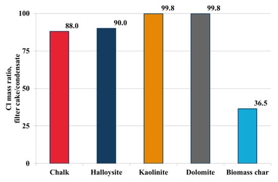 For filter cakes, the results of Cl content are presented in Table 5. The results indicate that biomass char contained 16.9-fold higher Cl concentration than the biomass before thermochemical treatment, which supports the theory of Cl readsorption on the bed of char or its preference to remain in the concentrated solid phase composed of ash and char.
