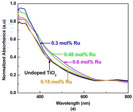 where hυ = photon energy, α = absorbance coefficient, Eg = bandgap energy, A = constant and the exponent ‘n’ depends on the type of transition and it may have values of 1/2, 2, 3/2 and 3, corresponding to the allowed direct, allowed indirect, forbidden direct and forbidden indirect transitions, respectively. As shown in the Figure 4b, undoped TiO2, 0.15, 0.3, 0.45 and 0.6 mol% Ru-doped TiO2 nanomaterials have bandgap values of 3.16, 3.12, 3.05, 3.02 and 2.98 eV, respectively (straight-line intercept to the energy axis). The reduction in bandgap can be attributed to the insertion of Ru into the TiO2 lattice. Since the lower edge of the CB is made up of Ti4+ 3d bands [15], the substitution of Ti4+ with the Ru cation might have affected the CB structure. A similar observation has been reported by Wang et al., Lu et al. and Ismael et al. [29,33,41].