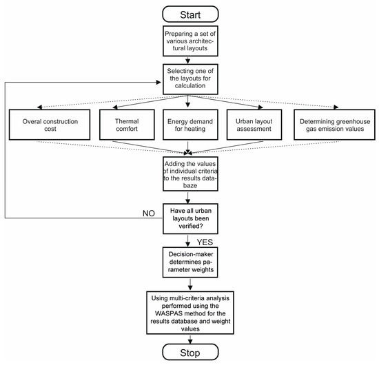 The design optimisation task analysed by the authors is an actual design problem. The analysed complex of forty experimental buildings was, at the time of the writing of thepaper, planned to be constructed in the municipality of Mogilany near Krakow, Poland. The developer must select one of several urban layout alternatives, which is to be optimal in terms of cost and energy demand minimisation, in addition to being compliant with the precepts of sustainable development and real estate market preferences. The urban layouts under analysis can differ in terms of building siting, as well as the size or type of buildings (detached, semi-detached, terraced). Criteria values were determined for these layouts. The criteria adopted for the analysis included: overall construction cost, building energy demand, greenhouse gas emissions associated with building occupancy, building thermal comfort and an assessment of the urban layout by potential buyers. After setting parameter values for all alternatives, the decision-maker (developer) can set the weights of each parameter. After preparing the data in the listed manner, the authors conducted a multi-criteria optimisation using the WASPAS method. A block scheme of the proposed method will be presented in Figure 1. The method of setting the values of individual criteria will be presented in the following sections of the article.