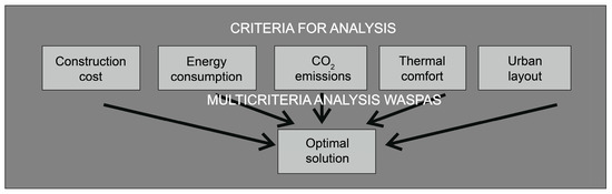 The parameter sets selected by the authors (construction cost, energy demand, CO2 emission, thermal comfort, urban layout assessment) are diverse and cannot be directly compared. This is why the authors decided to utilise a multi-criteria decision-making approach. There are numerous MCDM methods, such as AHP, ANP, ELECTRE, BIPOLAR, TOPSIS and many others [64,65]. For this specific problem, the authors selected the WASPAS method. It is a method that combines two other methods: the Weighted Sum Model (WSM) and the Weighted Product Model methods (WPM) [66,67,68]. The WASPAS method was selected because of its mathematical simplicity and capacity to provide highly precise results when compared to the WSM and WPM methods. The WASPAS method is currently widely accepted as an effective decision-making support tool [68]. It is continuously being developed (e.g., by integrating a fuzzy approach) [69,70].