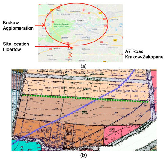 The planned housing complex which is the subject of the case study in this article is planned to be built on a 3-hectare plot in Libertów, in the municipality of Mogilany near Krakow, in the Lesser Poland Voivodship (Poland). The site is adjacent to an expressway which leads in the direction of Zakopane, a popular tourist destination located in the mountains. There is a lot of traffic along this road, particularly during weekends and holidays. The location of the experimental housing complex has been shown in Figure 3.