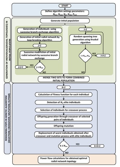 This paper is organized as follows: Section 2 gives a general overview of the proposed algorithm; Section 3 defines algorithms for the efficient initial population generation based on a successive branch-exchange algorithm and stochastic Kruskal’s algorithm; Section 4 describes and illustrates the main modifications introduced in the genetic algorithm process (crossover, mutation), specifically adjusted for the distribution network reconfiguration problem; Section 5 provides results of the proposed method on different test case networks, as well as a comparison with other state-of-the-art approaches; Section 6 gives main paper conclusions.