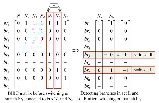 In order to detect branches belonging to the set L and set R, after the formation of the single cycle in the network, we use the BIBC (bus injection—branch current) matrix that is often used in the load flow calculations for the radial or weekly meshed distribution networks. If we assume that the distribution network and its data is topologically sorted and the multiple supply points are represented as a single supply point, the algorithm for the formation of the BIBC matrix consists of few simple steps: