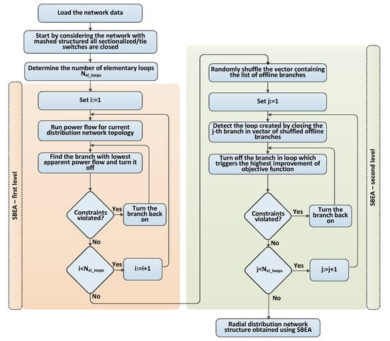 The BIBC matrix that is formed for the radial distribution network prior to closing branch brb can also be used to approximately calculate active and reactive power flows along all online branches in network (used in Equations (8)–(10)). The flowchart illustrating all steps of SBEA is shown on Figure 4.