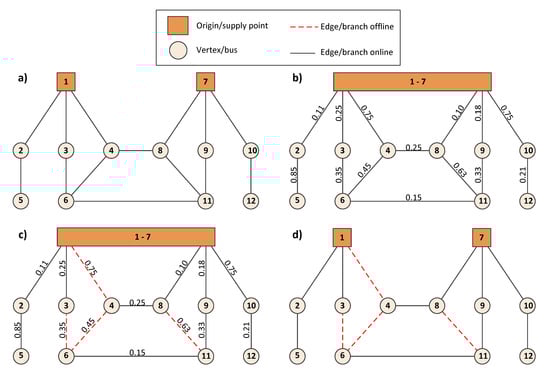 From every pair of parents two new offspring are created, which need to keep the part of the parent’s genetic material, preferably the best one. In most of the approaches that employ evolution algorithms for the network reconfiguration problem, this is usually the point at which the problems appear [,,,,,,,,]. These problems are related to the methods used in the crossover process, which result in offspring that violate radiality constraint or have isolated parts of the network. Given that, the offspring are usually further analysed and corrected to impose radiality and connectivity constraints. In addition to prolonging execution time and slowing down the convergence rate, these correction algorithms usually significantly change offspring so that they no longer resemble and contain the best genetic material from their parents. Given this, we introduce the improved approach, which deals with and eliminates these problems.