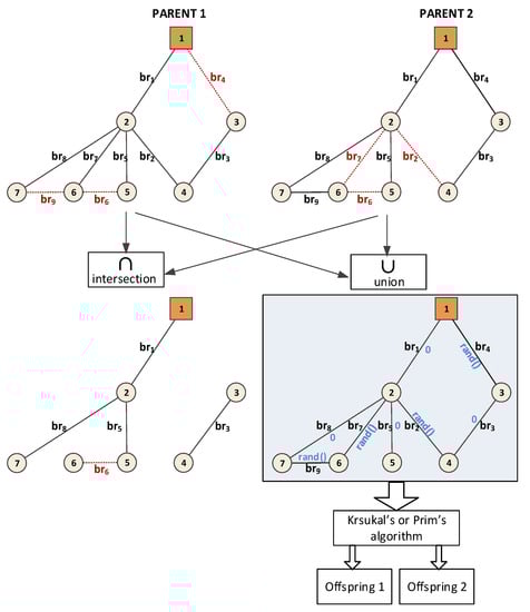 An illustration of the crossover process that we propose is shown on Figure 6. During the crossover process, we find an intersection and union of online branches included in both of the parents. The process of obtaining children is based on a subgraph that is made from the union of online branches of both parents, to which we assign weight in specific manner. Zero weight is assigned to all online branches that belong to the parent online branch intersection. Other branches that are present in union of online parent branches are assigned random weights. Applying Kruskal’s or Prim’s algorithm on a weighted subgraph created in such a way, we obtain a single offspring. To obtain two offspring, we repeat this process by refreshing random weights assigned to the branches that are not members of parents’ online branch intersection. Using this method of crossover, all ‘good’ genetic material is imprinted in children. Children contain all branches that appear in both parents and part of branches that make difference between parents. Offspring obtained in this way are guaranteed to fulfil the radiality and connectivity constraints without the need for further offspring rechecking or corrections.