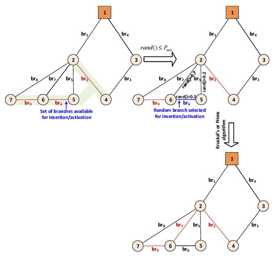 The mutation process can be improved even further if SBEA is introduced in this process. This way, using Equations (8)–(11), depending on the objective function, we can improve the network topology through the mutation process. Both approaches guarantee that the individual mutated in this way will fulfil radiality and connectivity constraints without the need for further rechecking or corrections.