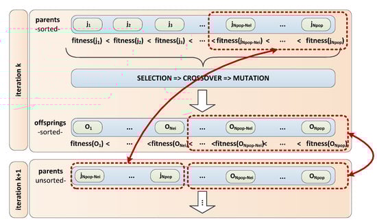 Elitism is a process which is introduced to enable the best individuals to participate unchanged in the next evolution epoch. This means that Nei individuals with the lowest fitness function values are substituted with the same number of parents that have the highest fitness function. An illustration of this process is shown on Figure 8.