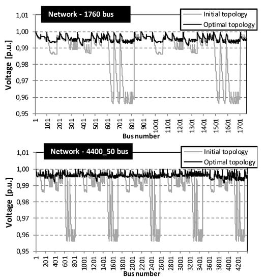 Figure 10 shows the network voltage profile before and after network reconfiguration for the 1760 and 4400_50 bus network. Although the primary objective was network active power loss minimization, network reconfiguration provided topology with a more balanced voltage profile in relation to starting network topology. These positive effects of network reconfiguration on voltage conditions are evident, both for the 1760 and 4400_50 bus network. Given that the 1760 and 4400_50 bus network share topological similarities (both were derived by replicating the 880 bus network and adding additional tie lines), a similar voltage improvement is evident in both cases. A relatively wide voltage profile, characteristic for initial topology (1.0–0.956 p.u.), is indirectly reduced through network reconfiguration to range (1.0–0.991 p.u.), with bus voltages very close to nominal values and more homogeneous voltage profile distribution.