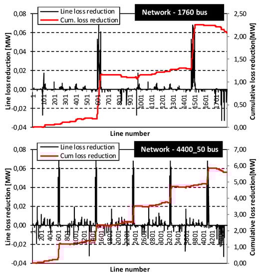 Figure 11 shows the decrease/increase of the line active power losses for the optimal network topology in relation to the initial network topology for the 1760 and 4400_50 bus networks. From Figure 11, we can see the cumulative decrease of active power losses in the amount of 2.078MW for the 1760 bus network and in the amount of 5.581 MW for the 4400_50 bus network, in relation to the initial network topology. This represents a 69.5% (for 1760 bus network) and 74.6% (for 4400_50 bus network) decrease of active power losses in relation to the initial network topology.