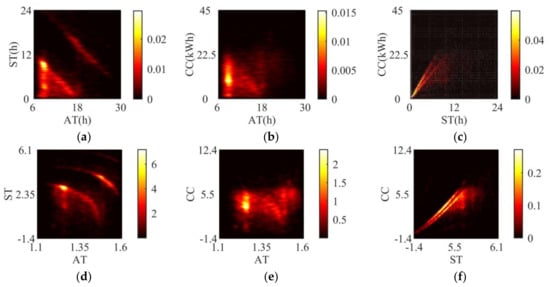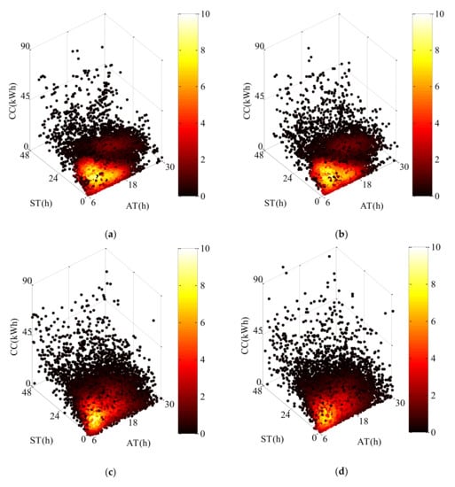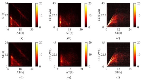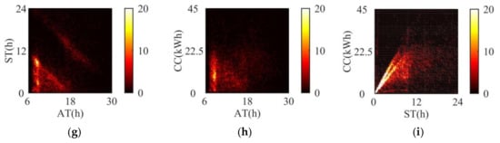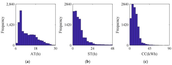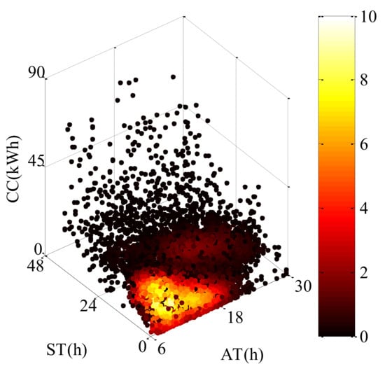 After time-space aggregation, data records in the work area, the residential area, the commercial area, and other areas are 11,740, 681, 1042, and 792, respectively. As can be seen from data, the work area has the largest number of data records (up to 82%), while few records can be found in the residential area, the commercial area, and other areas (accounting for less than 7.3%). In that case, in order to guarantee the rational modeling, the combined distribution of the EVs arrival time (AT), the staying time (ST), and the charging capacity (CC) were analyzed with the EVs operating data in the work area as the original data (as shown in Figure 2) for concluding the charging behaviors law of EV users, which can provide the basis for studying EVs charging load modeling, the impact of charging on the PG, orderly charging strategies, and planning of charging facilities.