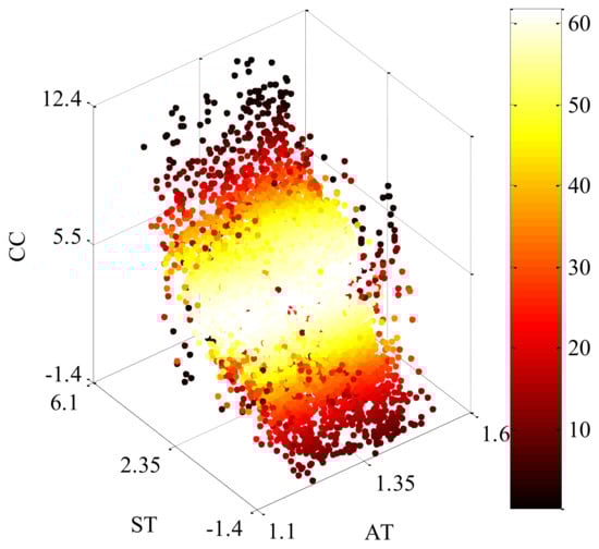 In this paper, transformed parameters of the AT, the ST, and the CC were estimated with the maximum likelihood estimation method. Estimated results of various parameters are shown in Figure 3. When the parameter estimation results are taken as −0.5575, 0.2170, and 0.3992, corresponding maximum likelihood functions are maximized. Based on this, the data transformation model was utilized to perform normal transformations on the AT, the ST, and the CC in the original data, respectively. The scatter density map (yellow means high density) of the transformed data (without units) is shown in Figure 4. A total of 74.3% of the scattered points (with yellow) gather around the center area in Figure 4, and 87.3% of the scattered points (with non-yellow) in Figure 2 are relatively dispersed. Therefore, most of the scattered points in the 3D space gather around the center area after the normal transformation of the original data.