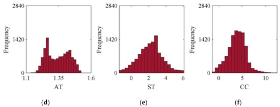 In general, the skewness can be used to detect whether the data conforms to a normal distribution. If so, it is equal to 0 [25]. In order to better illustrate the effect of data transformation, the frequency histograms of the original data and the transformed data (without units) in all dimensions are given in Figure 5. Additionally, the corresponding skewness results were calculated as (0.7994, 2.1144, 1.8073), and (0.0830, −0.0062, 0.0192). Therefore, the distributions of the transformed data in all dimensions are closer to the normal distributions than those of the original data, and a better normal transformation effect can be observed in the ST and the CC data.