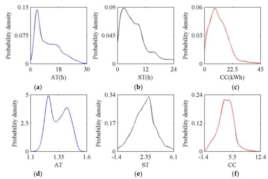 The frequency histograms of (a) arrival time (AT) original data, (b) staying time (ST) original data, (c) charging capacity (CC) original data, (d) AT transformed data, (e) ST transformed data, (f) CC transformed data.