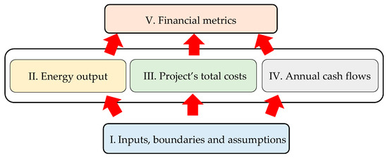 The output metrics of the model, including NPV, IRR, DPBP, CBR and LCoE are calculated using the Equations (1), (3), (4), (5) and (6), respectively.