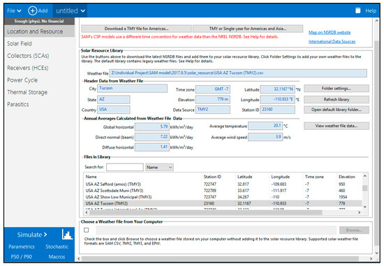 In order to run SAM simulations, the end-user needs to input all information that are required to calculate energy output from the CSP plant. Basically, SAM itself sets input assumptions by default when starting a new project file; however, the model users can change these default values to their specific values. After selecting the Tucson city from the built-in library, the weather data was fed as an input to the SAM. The SAM dataset contains detailed information about the city. These include: