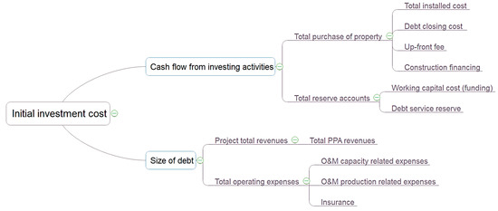 The initial investment cost (IIC) and annual costs (AC) are two important inputs for LCCA of an investment project or a technology development programme. IIC is the difference between the cash flow from investing activities in the initial investment year and the size of debt of the project. The financial model map for IIC of a CSP plant is represented in Figure 4. Denote by CFIA and SOD the cash flow from investing activities and the size of debt, respectively. Then,