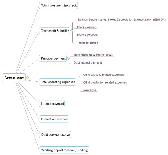 In order to estimate the annual costs, the financial model map in Figure 5 is used. The annual cost (AC) is calculated by summing total investment tax credit (ITC) in year one, tax benefit and liability (TB&L) and interest on reserves (IOR), and subtracting the total operating expenses (TOE), principal payment (PP), debt interest payment (DIP), debt service reserve (DSR) and working capital reserve (WCR) (funding). Therefore:
