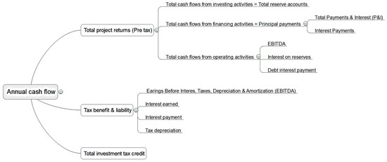 In order to estimate the annual cash flows, the financial model map in Figure 6 is used. The annual cash flow (ACF) is calculated from the sum of total project returns (pre-tax) (TPR), tax benefit and liability (TB&L), as well as total investment tax credit (ITC). Therefore,