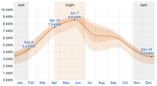 Tucson city has excellent solar resource for the development of both CSP and PV technologies. The average daily incident shortwave solar energy in Tucson experiences significant seasonal variation over the course of the year. The brightest time of the year lasts for around four months, from April to July, where the average daily incident shortwave energy per square meter (m2) is above 7 kWh. The darkest time of the year lasts for about three months, from the beginning of November to January, where the average daily incident shortwave energy is below 4 kWh/m2 [28]. Figure 11 shows the average daily incident shortwave solar energy per m2 in Tucson city during a year.