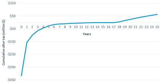According to the results, the internal rate of return (IRR) of the investment was calculated as 12%. This percentage is found very close to the average IRR value reported for parabolic trough CSP technologies in industry (~11.72%) [33]. The DPBP for CSP plants with parabolic trough technology is reported in the literature to be between 6.5 years and 17.6 years [33]. Our analysis shows that in the first quarter of year 17 of the project, the initial cost of the investment will be recovered.