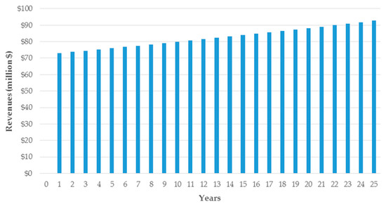 Figure 13 shows the annual revenue from the CSP investment during 25 years of project lifetime. As can be seen, the annual revenue trend shows an almost constant increase, referring to the yearly growth in PPA price which is 1%. If the factor of time of delivery (TOD) in the financial analysis is assumed to change depending on the time period (peak or off-peak), the PPA price will then be influenced and thus the pattern of revenues will become different.