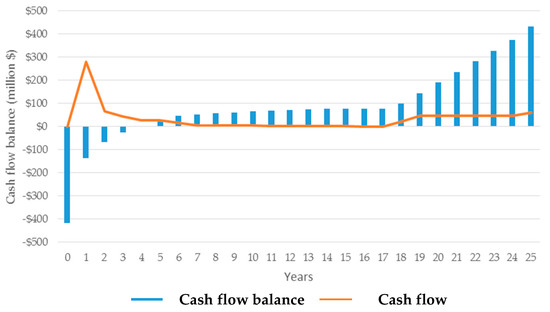 Figure 14 shows the trend of annual cash flow balance as well as cash flows of the project over 25 years. The significant amount of cash flow at the beginning of the project is because of the initial investment. In later years, the cash flow represents the returns from plant operation and debts payment. As a result, the trend decreases until year 17 when the initial cost is fully recovered. Additionally, when debts are entirely paid in year 18, this increases the cash flow in the positive direction until the end of the project lifetime.