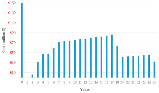 Our through-life cost analysis model is built based on the assumption that the investment is owned by a single owner. Generally, an entity that enters into a single owner structure receives all of the cash and tax benefits from the project. The investor often creates a special purpose entity—sometimes referred to as a special purpose vehicle (SPV)—for the project assets and pays the project’s capital costs with funds from other operations. However, the project cash flows, tax incentives, and depreciation benefits remain with the owner. This structure is generally used for renewable energy projects as it represents one of the simplest methods of owning and operating a project [21]. Other assumptions that are taken into account when building the model are listed below: