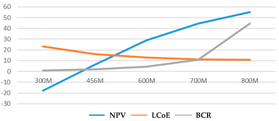 The effect of energy production (kWh) on NPV, BCR and LCoE.
