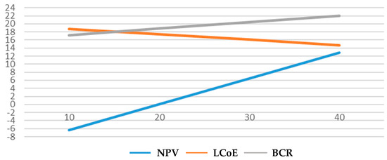 Figure 17 shows the effect of variations in investment tax credit (%) on NPV, BCR and LCoE. As can seen, unsurprisingly, the NPV and BCR increase while LCoE decreases with the increase in ITC rate.