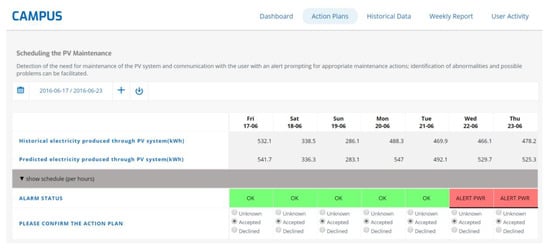 Starting from April 2016, the DSS tool was available for the campus. For instance, at the end of June 2016, when an alarm was triggered for the campus PV, the user verified that an actual problem affected the system (in particular, the inverter connecting it to the network) by inspecting the values of the power produced by the PV, which are logged in the microgrid SCADA; the behavior of the power over time evidenced that the system kept going off-line and restarting due to a fault in the inverter controller, thus causing the loss of generated energy (Figure 3). In this respect, the user contacted the inverter maintenance service to solve this malfunction.