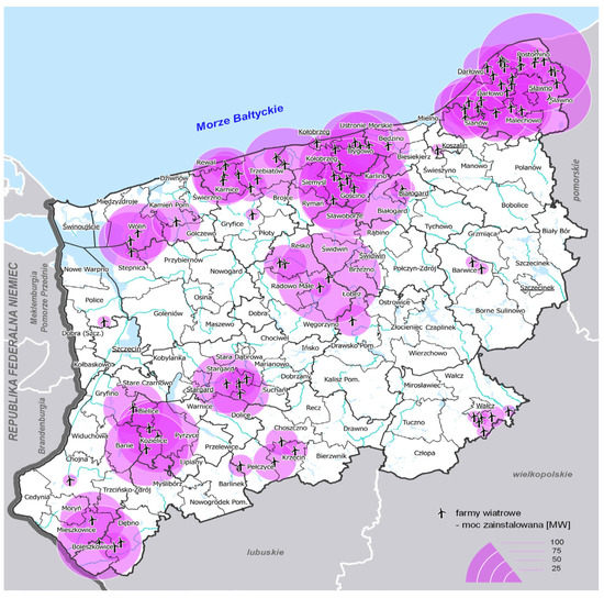 Location of wind farms in the West Pomeranian Region. (Source: Based on data from the Regional Bureau of Spatial Management of the West Pomeranian Region, as of 31/03/2018.)