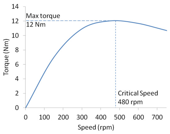3D Finite Element Method modelling was used as a reference (refer to Figure 1), in the form of a conductor disk and electromagnetic circuit. The design parameters were then applied, as stated in Section 4.1 of the simulation. The output data from the simulation were the braking torque with variations in speed, as shown in Figure 4. The value of the braking torque at the initial speed immediately showed a significant increase. It was because of the use of nonmagnetic materials with a low electrical resistance, so the generated eddy current was a considerable value. Here, the increase in braking torque will be smaller because of the increase in speed until obtaining the maximum torque. Even when the speed is increased, the braking torque will tend to decrease, which is due to the effect of the smaller value of the skin effect. The rotating speed of a conductor when the maximum torque is obtained is called the critical speed. To facilitate this discussion, the available speed was divided into low and high speeds, where the limit of both is critical speed.