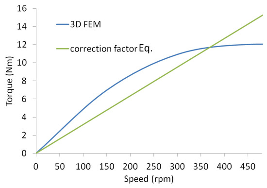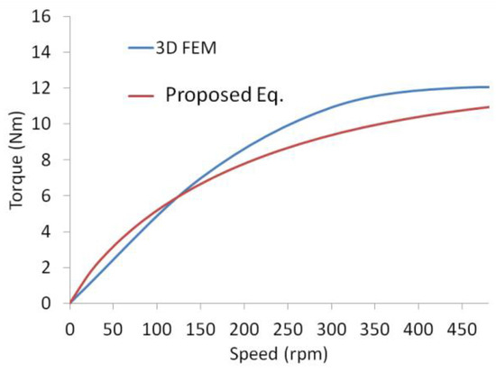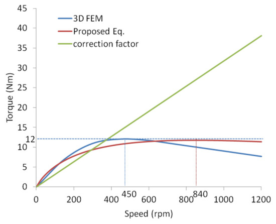 The braking torque calculation in this subsection was achieved by adding the correction factor, as given in Equation (5), while the correction factor was calculated using Equations (7) and (8). In Equation (8), it can be seen that the effect of the turn path resistance is calculated using fixed design parameters. The same occurs in the calculation of Equation (7), which influences the flux leakage. As such, the equation added by the correction factor will only change linearly. Moreover, based on the calculations of Equations (7) and (8), the values of each correction factor are fixed, namely α = 6.285 and C = 0.49. In the calculation of torque (Equation (5)), it can be seen that the torque value is proportional to the magnitude of the conductor rotation, so that the change in torque is proportional to the magnitude of the change in speed, as shown in Figure 5. As the results of the equation produce a linear value, the calculation of the braking torque using the correction factor does not have maximum torque or maximum torque of infinite value. The discussion in this section is limited to low speeds only, and this is to illustrate that the use of correction factors is only effective in that area. Here, Figure 5 is limited to only 480 rpm, or to the critical speed of the results. At the initial speed, the calculated braking torque was smaller than the simulation results. When approaching the critical speed, the predicted value of the equation exceeded the value of the simulation results. Figure 5 shows that the equation using the correction factor still produces a good predictive value on low-speed torque calculations, although the calculation results obtained were linear where the resulting value was different from the reference value. This is supported by taking into account the RMSE value, which is almost the same value when compared to the proposed equation. A full explanation will be discussed in the next section.