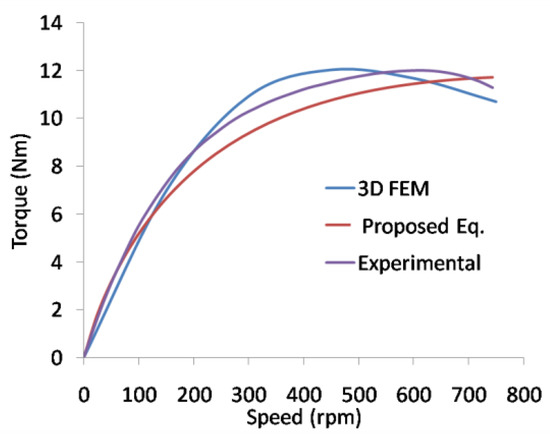 The use of the proposed equation shows an increase in the value of accuracy that can be seen from the small difference in the maximum torque and a low RMSE. The maximum torque prediction value is very close to 2.7% when compared with the 3D modelling, and 2.08% when compared to the real testing, although there were some biases in critical speed region. A comparison of the resulting torque patterns at variations in speed was obtained using a small RMSE value. The RMSE value, when compared to the simulation, was 1.79 Nm, and even smaller when compared with the real test of 0.65 Nm. The low RMSE value indicates the close prediction value at each point produced. The use of torque calculations considering the skin effect is proven to provide better accuracy compared with the equation using only correction factors.