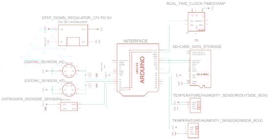 A low-cost prototype was built and calibrated in-situ versus high-cost equipment to attest for its capabilities. Low-cost sensing is undergoing change and expansion giving good indications of a promising future in air quality fields. Table 2 indicates possible ozone ranges and therefore equipment specifications in terms of detection limits. The developed equipment consists of an Arduino Uno interfacing with the DHT22, MQ-131 (Winsen Electronics, Zhengzhou, China) and MICS-4514 (Neuchâtel—Switzerland SGX Sensortech) sensors. Air quality sensor specifications indicate adequacy to measure 10 ppb–1 ppm for O3 and 50 ppb–10 ppm for NO2. A real-time clock (RTC DS1307) was installed to make a direct correspondence with the time of the day and pollutant concentration. An SD Shield 3.0 was used to store the data, and a fan was added to maintain airflow and refrigerate the box. The total cost of the final equipment is 92 € and its schematics can be seen in Figure 1.