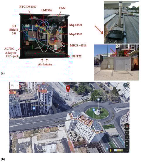 (a): Image of the prototype and subsequent mounting location on top of a reference air quality system (AQS); (b): Overview of the AQS location near the “Rotunda de Entrecampos”.