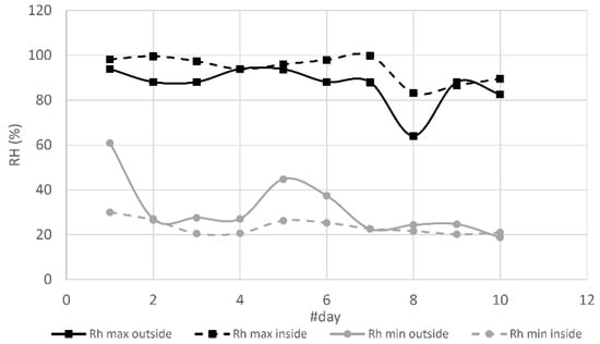 Relative humidity distribution in the prototype (outside and inside).