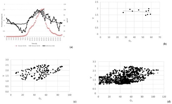 Without any T and RH correction, sensor #2 voltage is highly scattered towards a linear relation with real O3, especially with 1-h averages (Figure 5d). The linear model to correlate voltage and O3 values is not adequate. Moreover, using the linearity between voltage and O3, about 40% of the data would not comply with the Data Quality Objective (DQOs) of the European Air Quality Directive for indicative methods (between 25% and 30% of uncertainty for O3 and NO2). For the 8 h average, 37% of the data is outside DQO. For the daily average, 20% of the data is outside DQO.