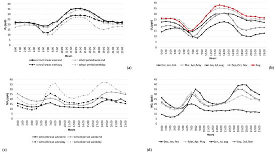 Another part of this study included the historical data of a real AQS near a traffic roundabout and the observation of correlations among measured variables: O3, NO2, T, RH, pluviosity, GR, and to get minimum and maximum values for LCS to see if they can measure within the DQO. All the historical data from 2017 was used for yearly analysis. The data for each hour of the day was averaged for the considered period to get its trends, so each pattern represents an average day in the respective period (Figure 6).
