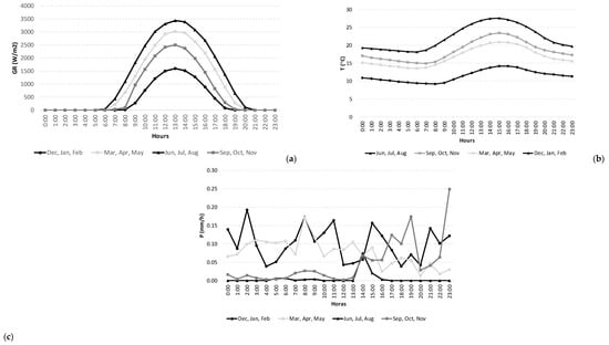 (a) Seasonal global radiation; (b) seasonal average temperature; (c) seasonal precipitation.