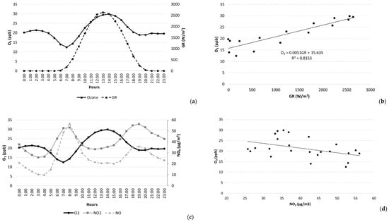 Tropospheric ozone correlations (a): average day of 2017 ozone with GR; (b): average daytime of 2017 ozone with GR; (c): school period weekday ozone with NOx and (d): average day of 2017 ozone with NO2.